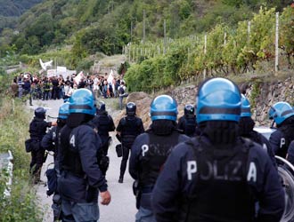 Venti persone si sono sganciate da questo gruppo avvicinandosi al cantiere: da qui, nascosti nel bosco e con il volto coperto, hanno iniziato un fitto lancio di oggetti contundenti (biglie di vetro, sassi, petardi, palloncini d’acqua) contro lo schieramento delle forze dell’ordine al di là della recinzione, utilizzando anche fionde, fumogeni e puntatori laser.